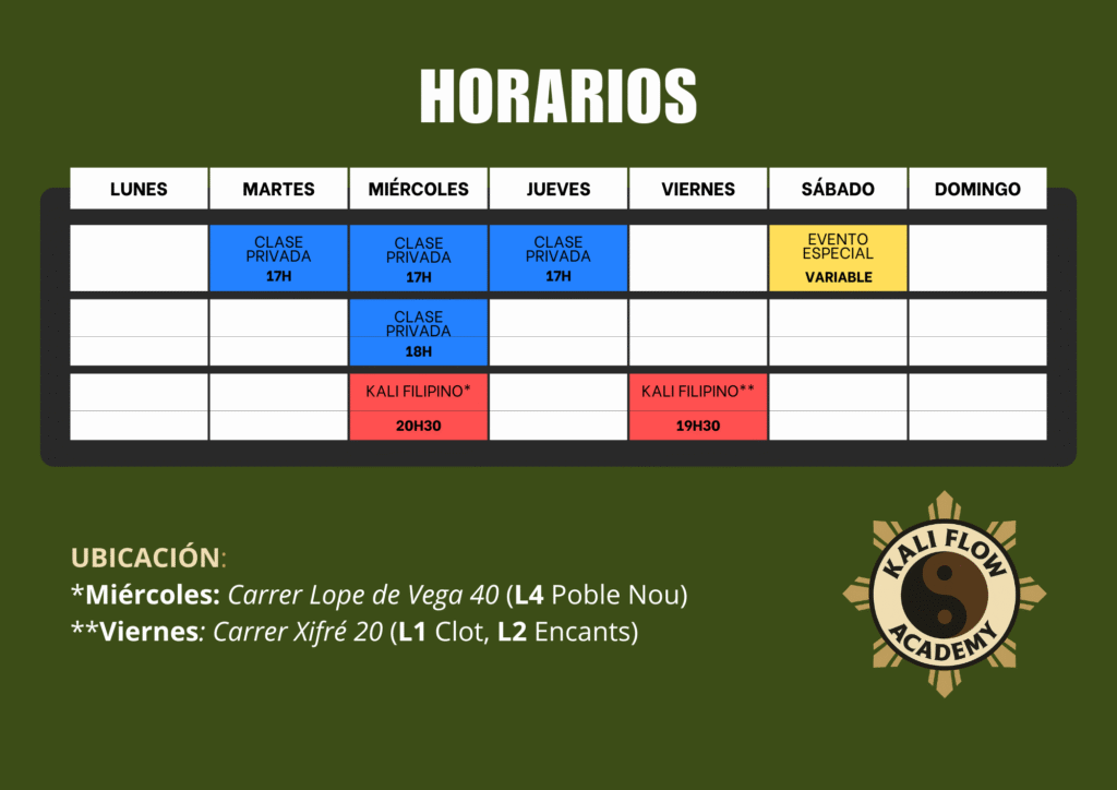 Reserva tu clase de prueba de Kali Filipino en Barcelona Te respondemos en menos de 24h. Material incluido. Sin compromiso. Nombre Completo*Email*Número de WhatsApp (opcional)¿Qué día quieres hacer tu clase de prueba?*Miércoles 20h30 (Poble Nou)Viernes 19h30 (El Clot)Algo que nos quieras contar (opcional)Ejemplo: experiencia previa, lesión reciente o alguna duda.EmailPROBAR CLASE GRATIS Activar JavaScript en tu navegador para enviar el formulario